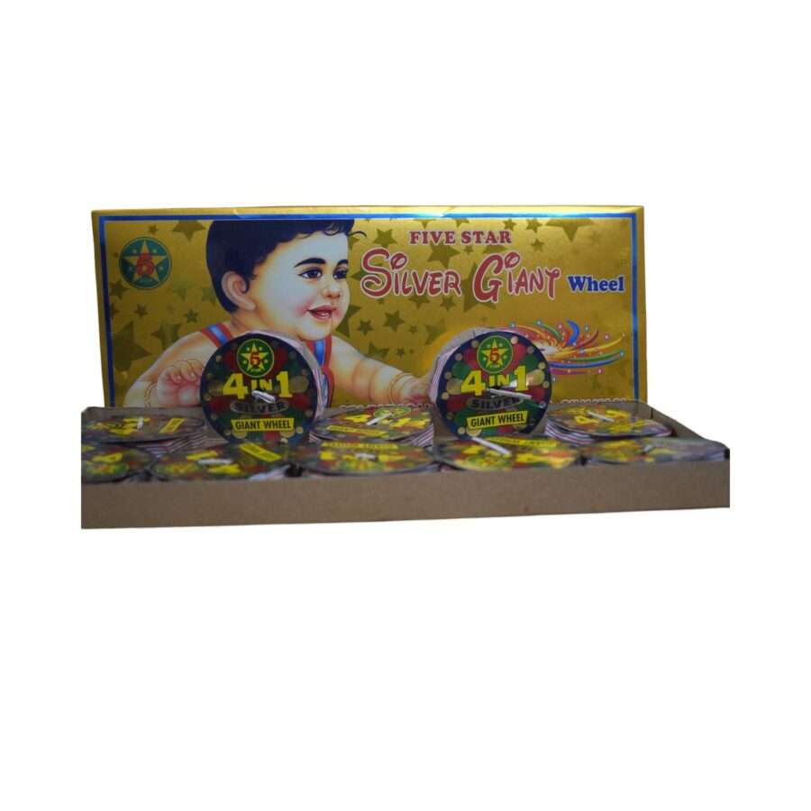The Silver Giant Wheel fancy wheel firecracker is a show-stopping addition to any celebration. Engineered for an extended spin time, this fancy wheel creates a brilliant display of silver sparks that whirl in a circular pattern, reminiscent of a spinning giant wheel. Its quick and lively movement is accompanied by a soft crackling sound, making it both entertaining and pleasing to the senses. The silver sparks shine brightly, making it ideal for evening events and outdoor celebrations. It’s perfect for festivals like Diwali, New Year’s Eve, birthday parties, and other special occasions where an extraordinary sparkling experience is desired.